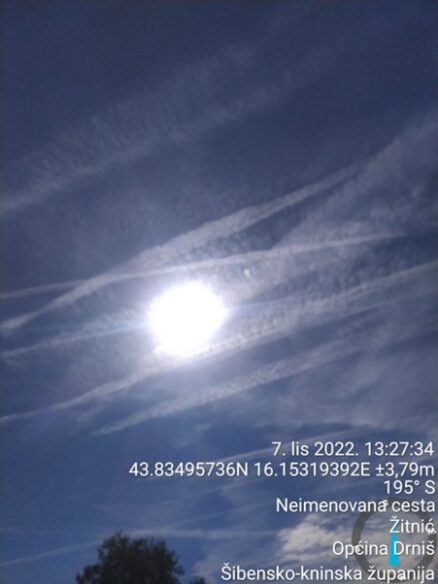 U petak 7. oktobra 2022. Hrvatska je navodno bila izložena jednom od ovih zaprašivanja. Preko mreže hrvatskih chemtrails promatrača fotografije stižu iz cijele zemlje, od unutrašnjosti do juga Dalmacije. Tvrde da avioni cijeli dan prolaze u svim smjerovima i ostavljaju mrežaste tragove koji nisu obični kondenzacijski tragovi već se šire i stvaraju laganu izmaglicu koja se širi nebom.
